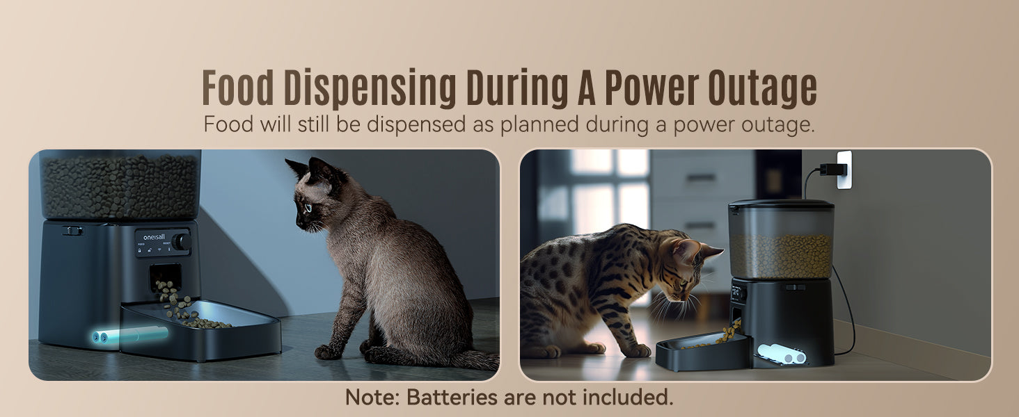 When powered by batteries only, the feeder can dispense food on time according to the set schedule even during a power outage, but you won't be able to use the app unless it is plugged in.